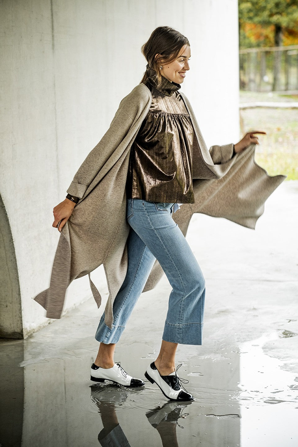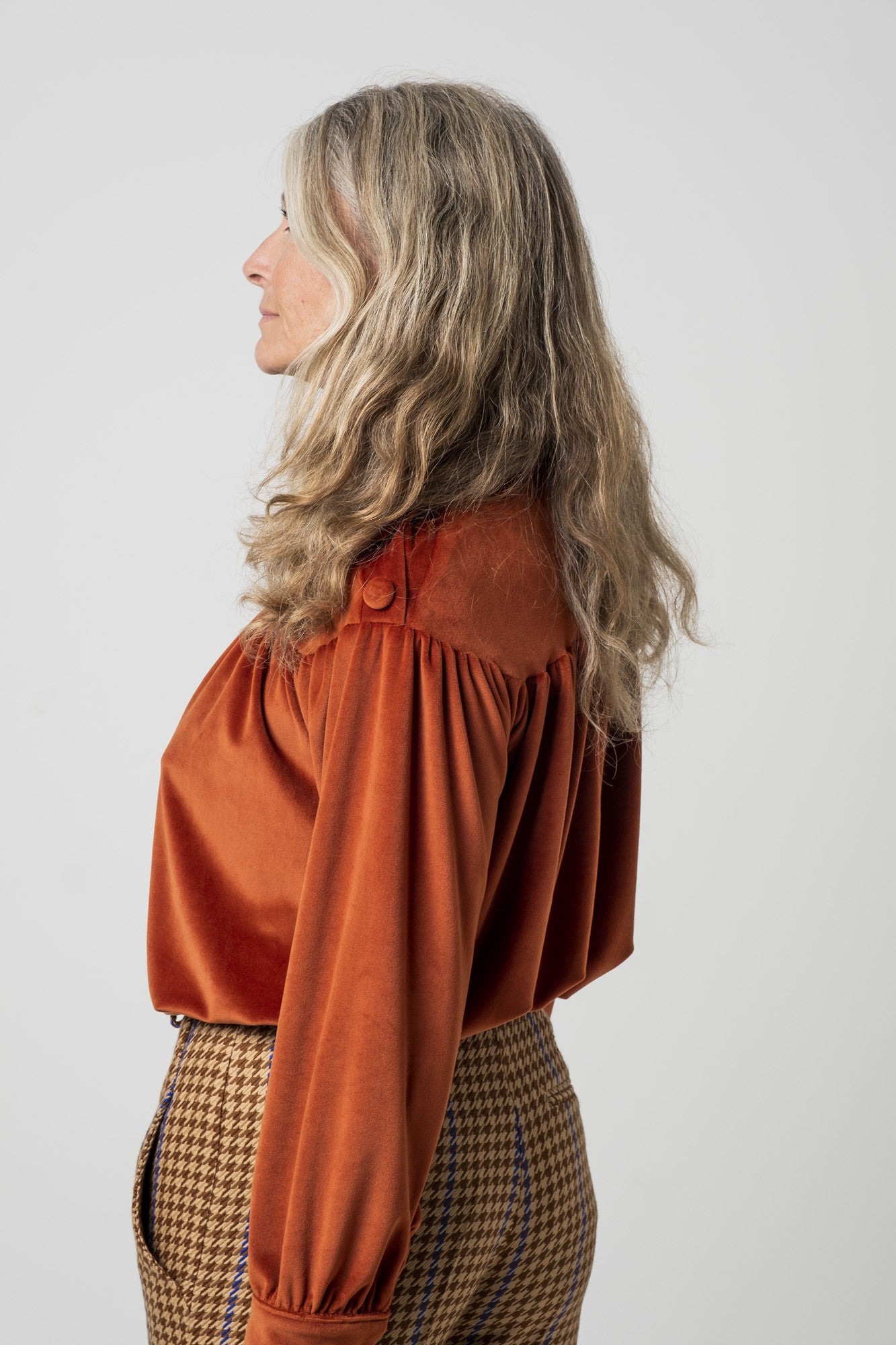 Das Top Glory steht für eine Kombination aus verträumt und lässig. Es ist ein Oberteil mit Kräuseln und Stehkragen, mit einer Knopflochleiste in der linken Schulter.