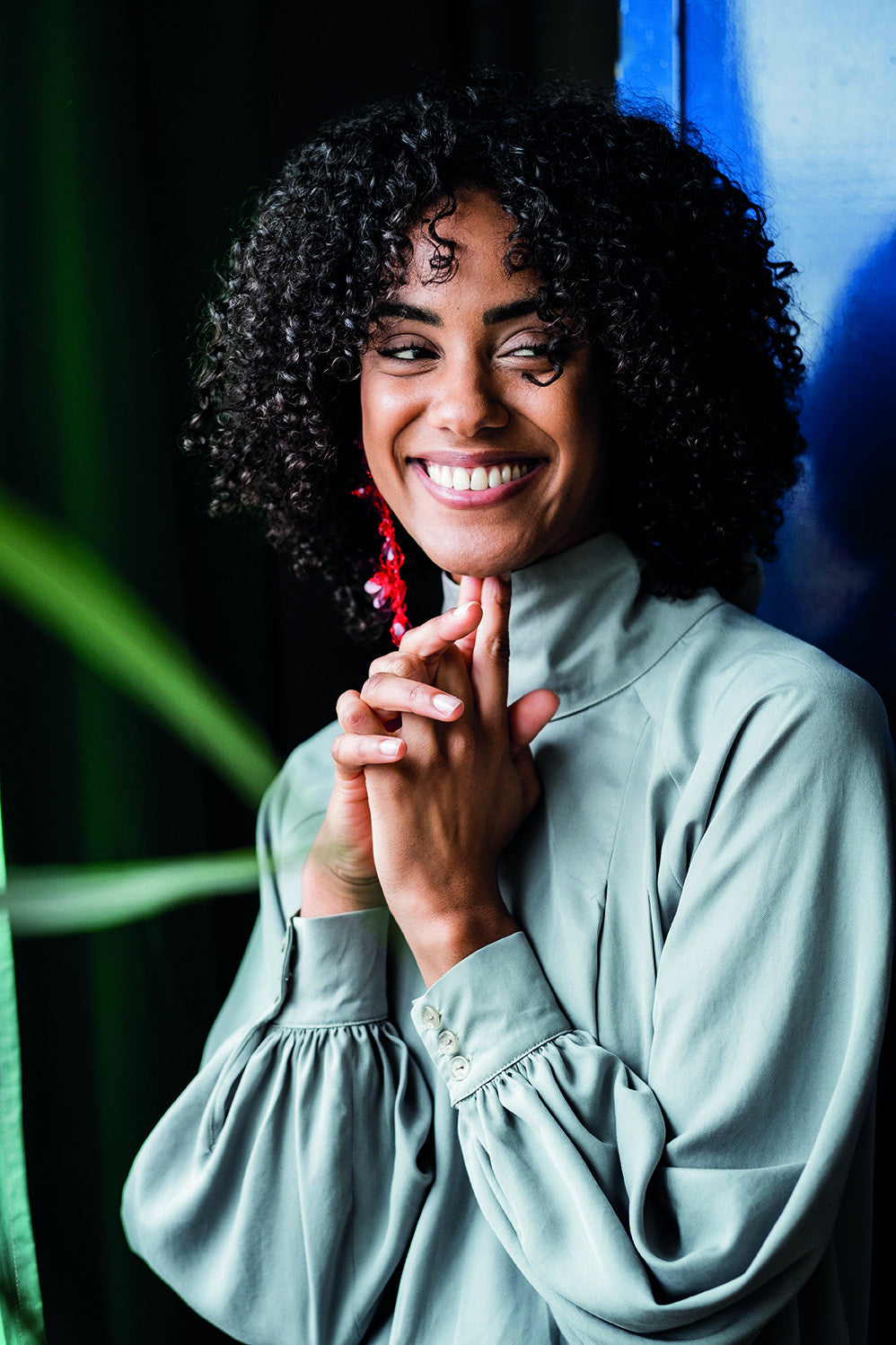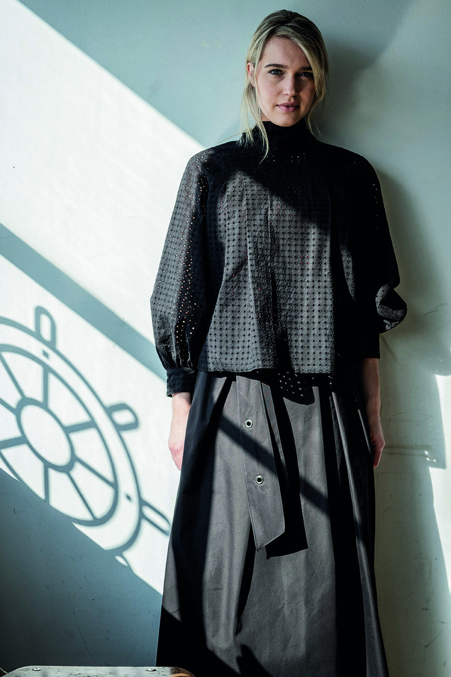 Lerne Grace kennen, eine hübsche Bluse mit Stehkragen und Raglan-Ballonärmeln mit schmalen Manschetten.