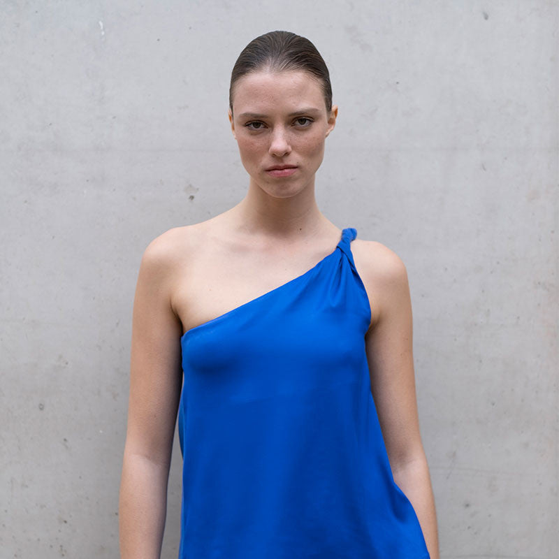 Dieses schlichte Hallie Top entspricht mühelos dem asymmetrische Trend der Saison und verleiht ihm durch den drapierten Twist-Effekt an der Schulter einen modernen Touch.