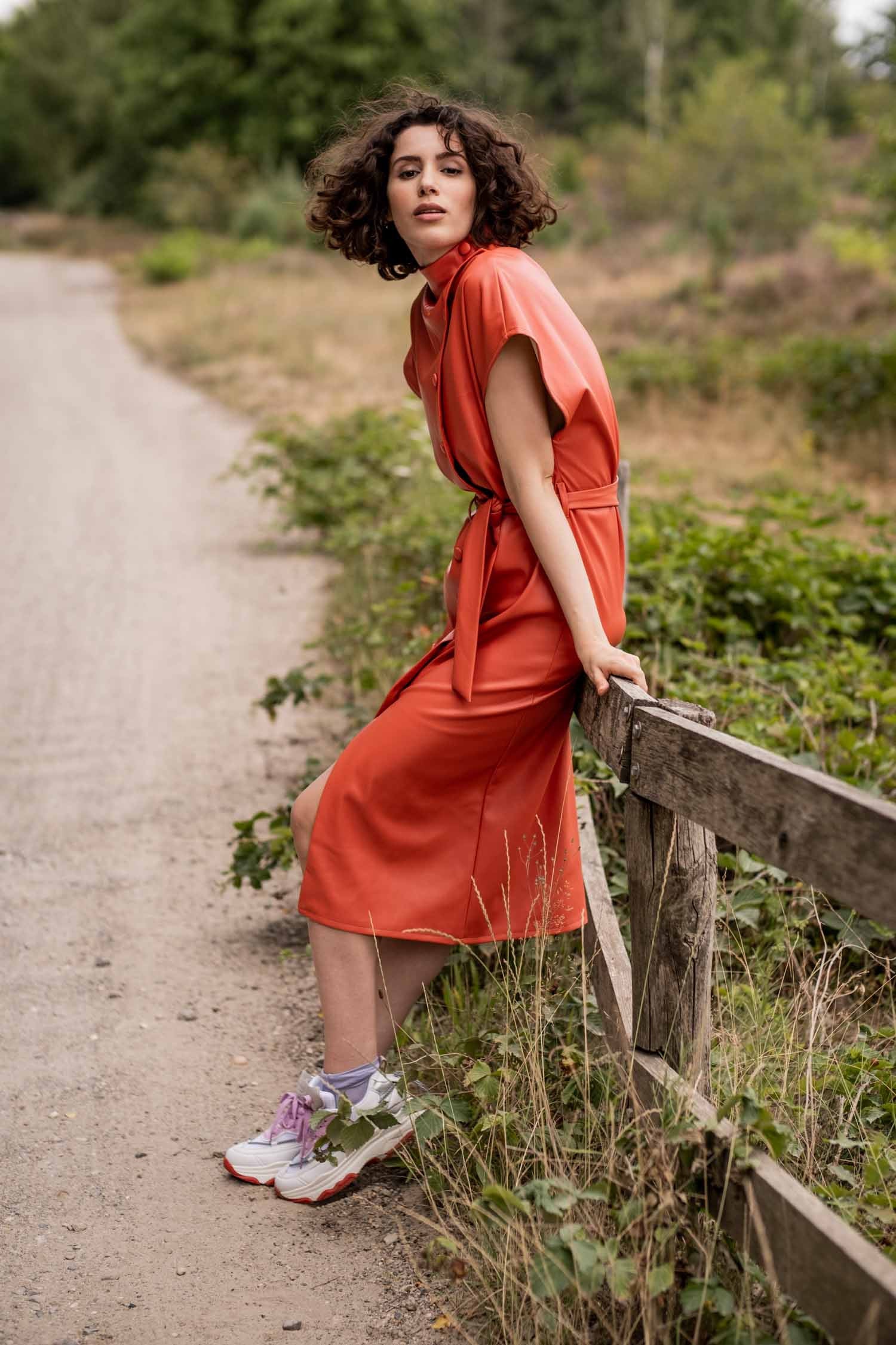 Irene glänzt in ihrer Schlichtheit. Ein schönes, gerade geschnittenes Kleid mit Stehkragen und einem asymmetrischen Knopfverschluss. Spiel ruhig mit der Länge dieses Kleids.