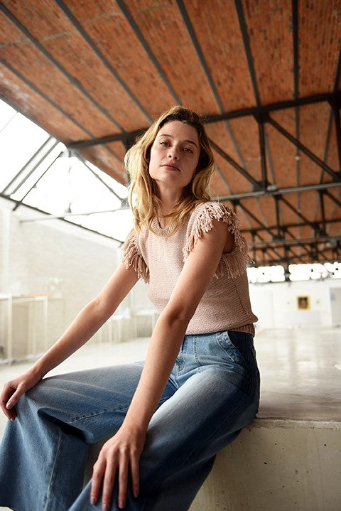 Lina ist ein sommerliches Top mit Rundhals-Ausschnitt und Fransen an den Ärmeln.