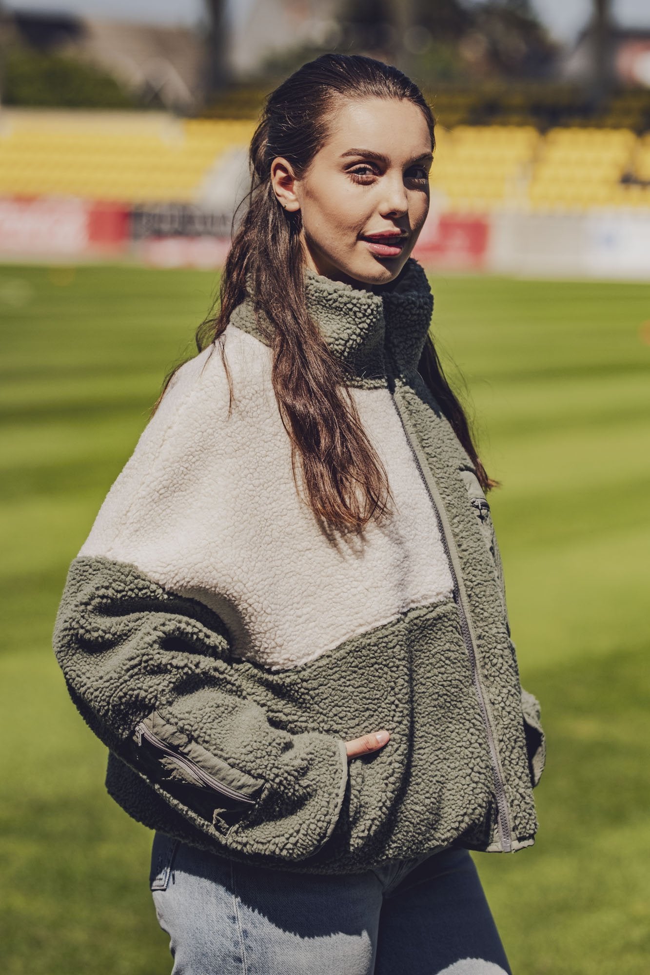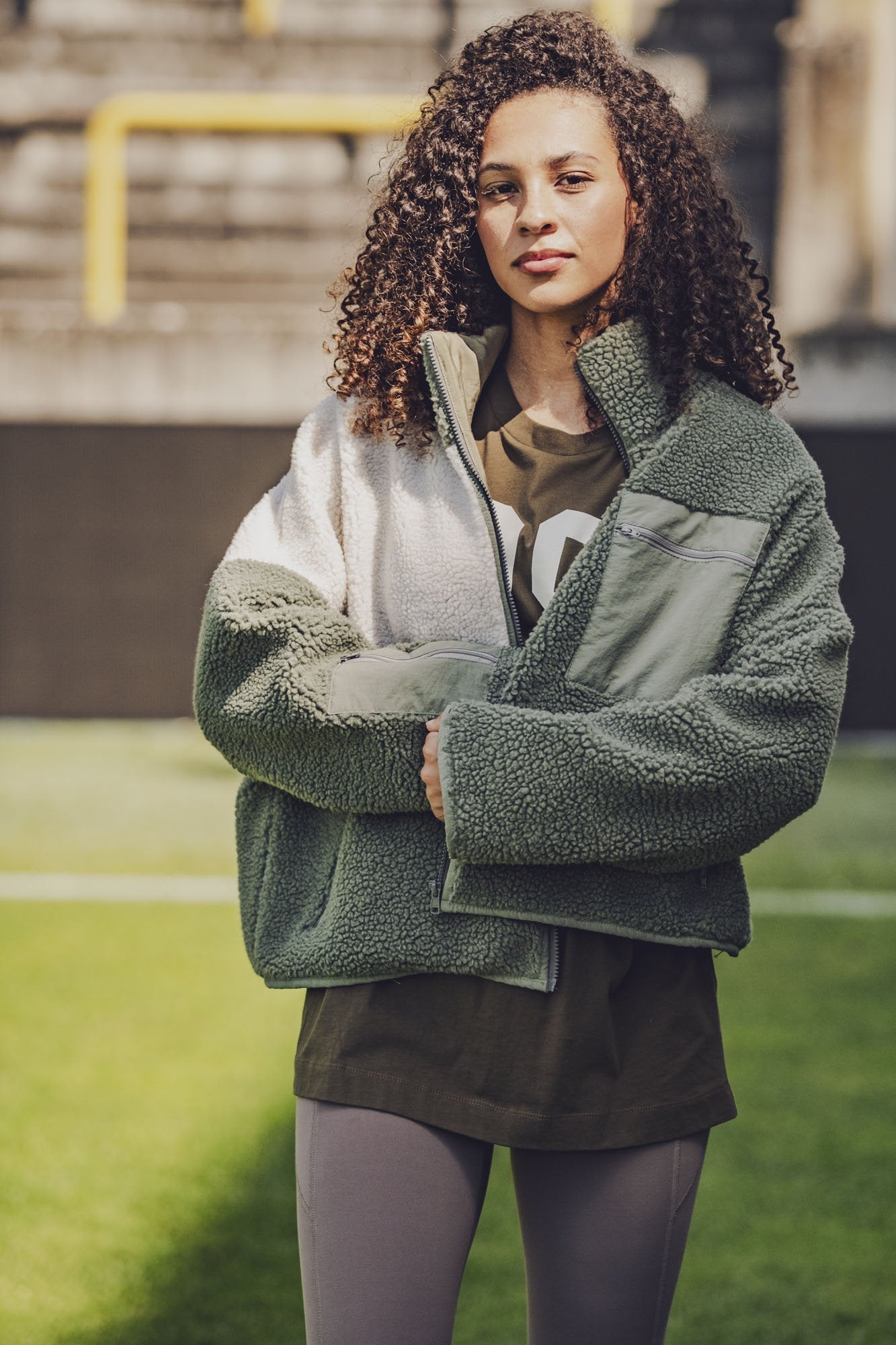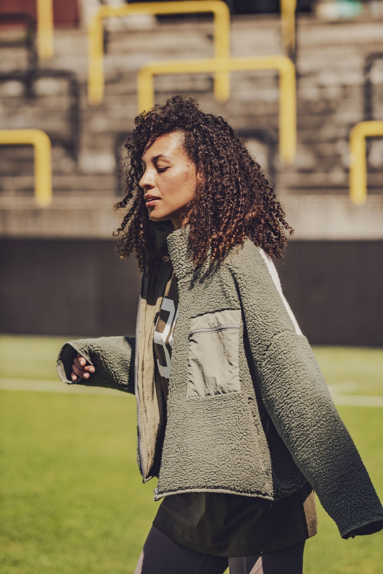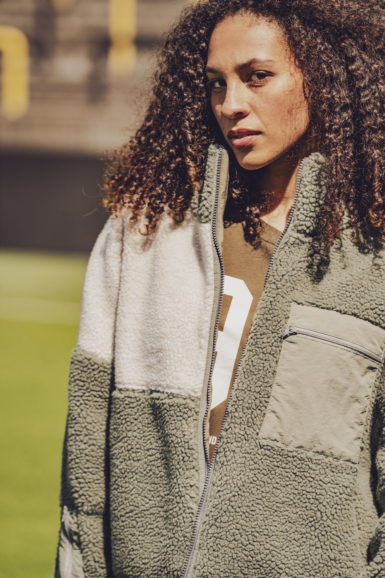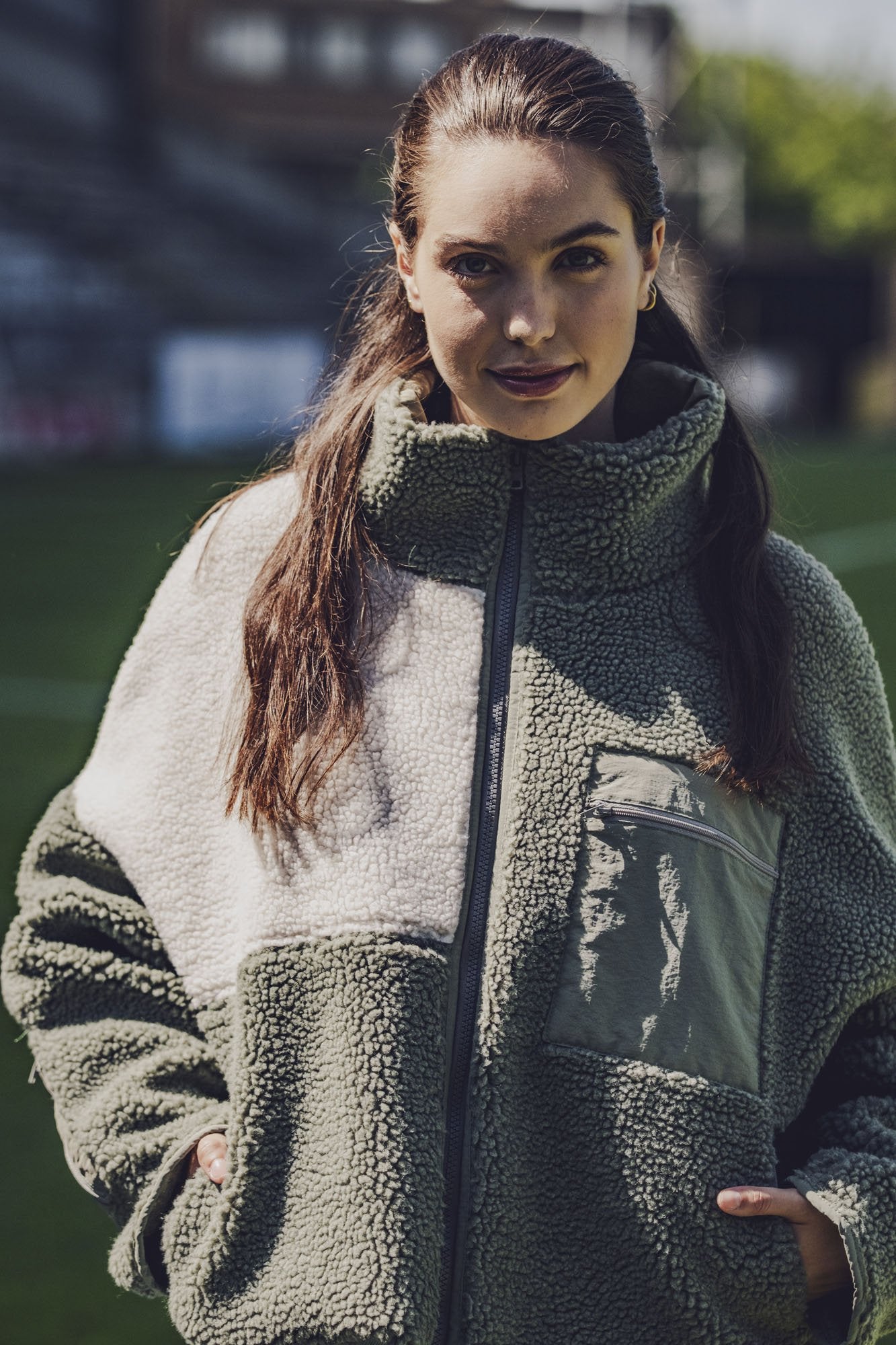 Raya ist eine bequeme Jacke mit einer leichten Oversize-Passform und einem Stehkragen. Dieses Must-have hat eine aufgesetzte Brusttasche, eine Tasche am Ärmel und schräge Eingrifftaschen, alle mit Reißverschluss.