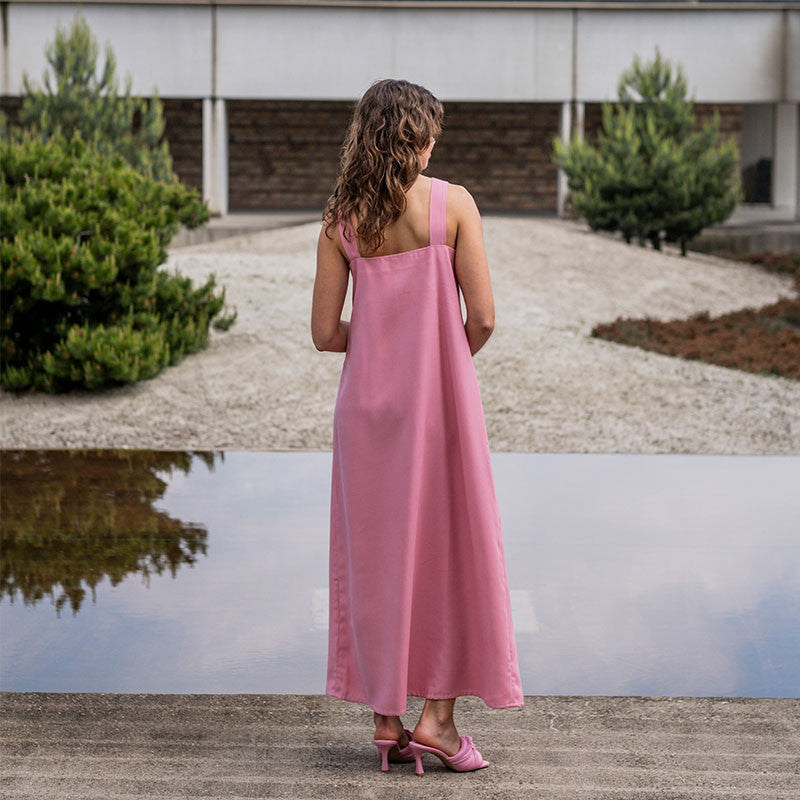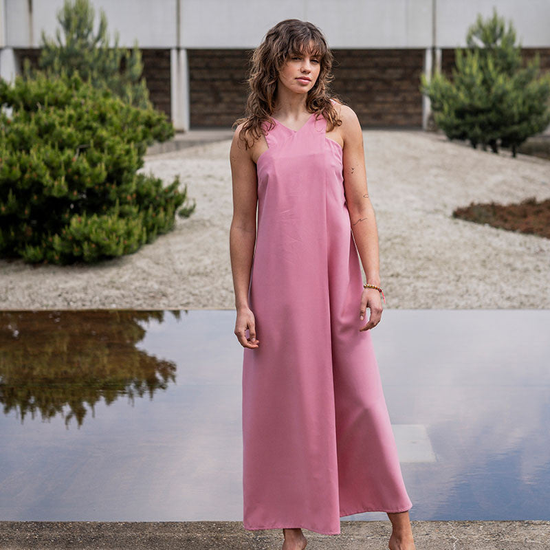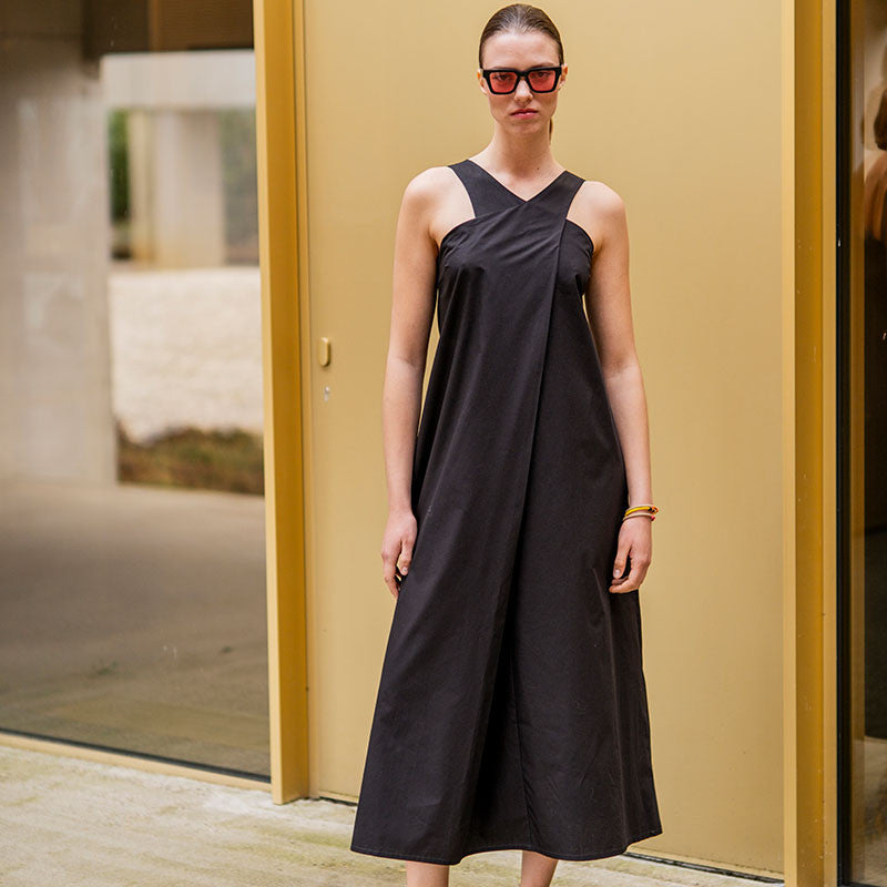 Een jurk met een twist, en dan letterlijk. De Alberthe jurk is een minimalistische jurk met gekruiste halteruitsnijding vooraan.