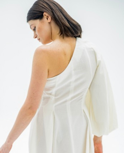 Ashley is en verfijnde one-shoulder jurk, die gemakkelijk kan worden omgevormd tot top of korte zomerjurk, omhelst jouw lichaam met figuurnaden die uitmonden in platte plooien.