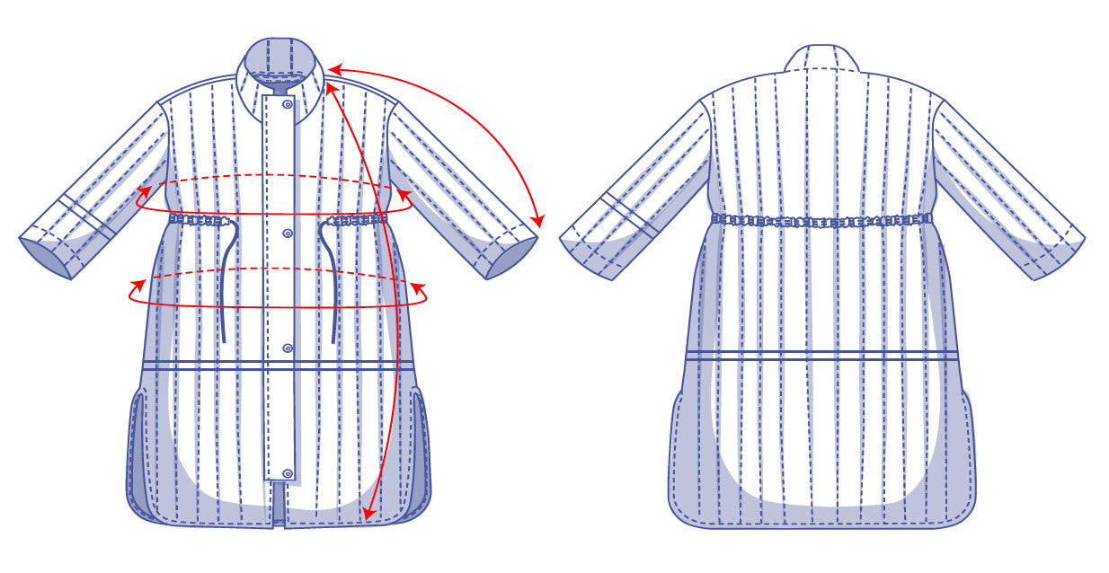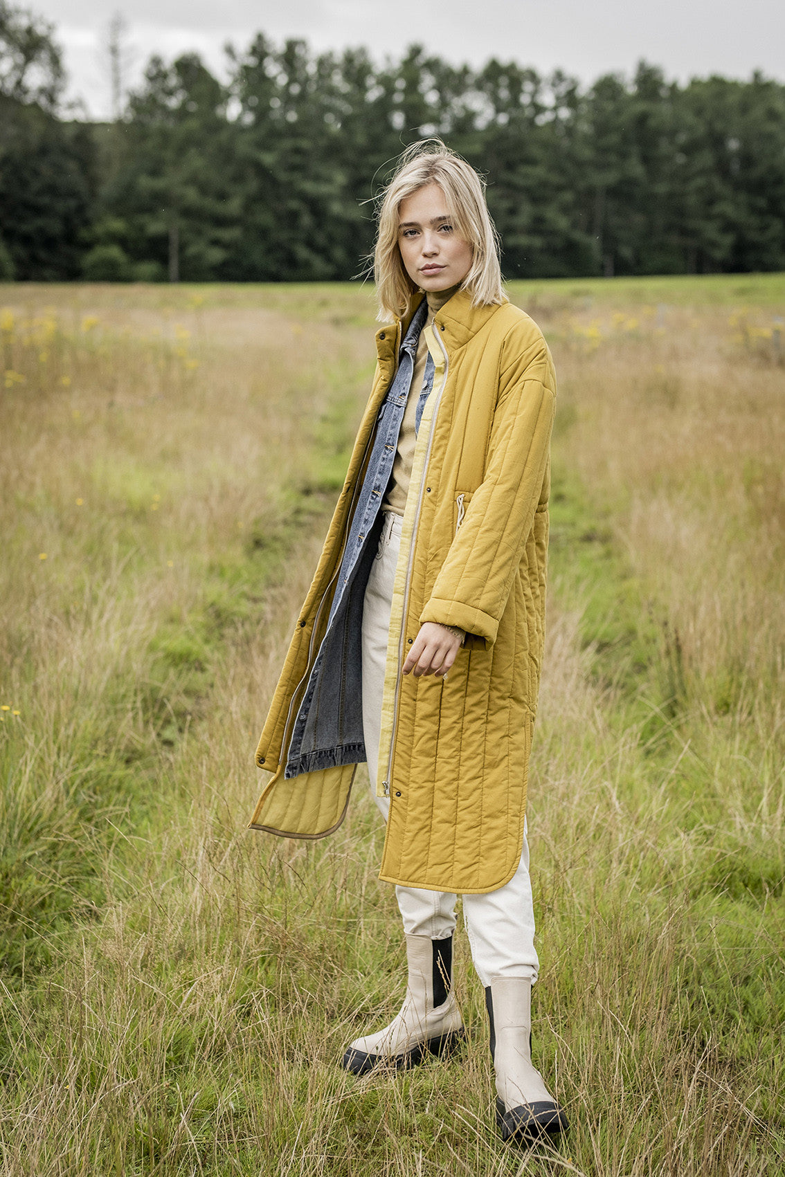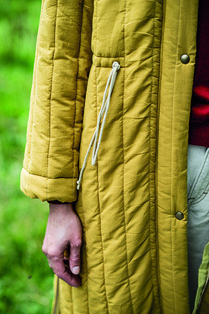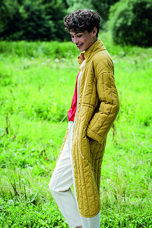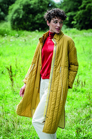 Giselle is a knee-length coat with a zip, straight set-in sleeves, and a standing collar. Tighten at the waist or don’t. We went for a wonderfully warm quilted fabric.