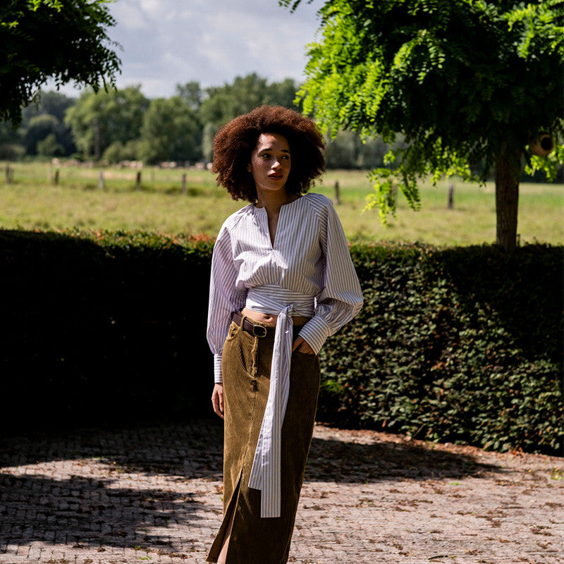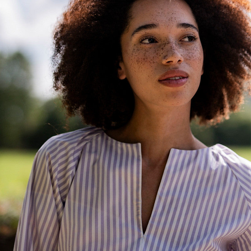 Leiko is bound to become your all time favourite. With its gathers at the shoulders and neckline in the back, this V-neckline top is a real showpiece.