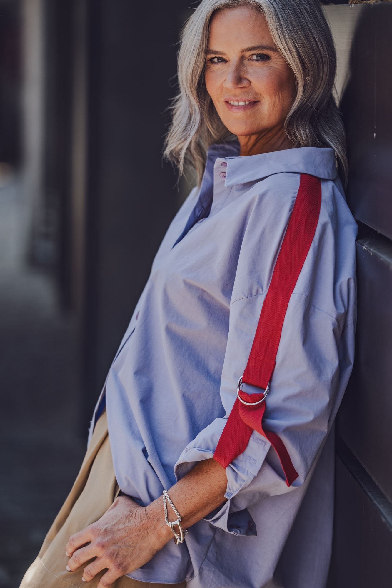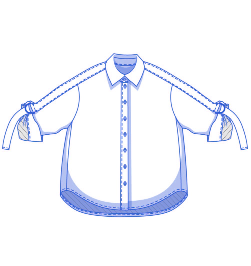 Lena is a quirky take on Libbie. The difference is in the sleeve and wrist cuffs: you tie the sleeve up with two twill ribbons and D-rings.