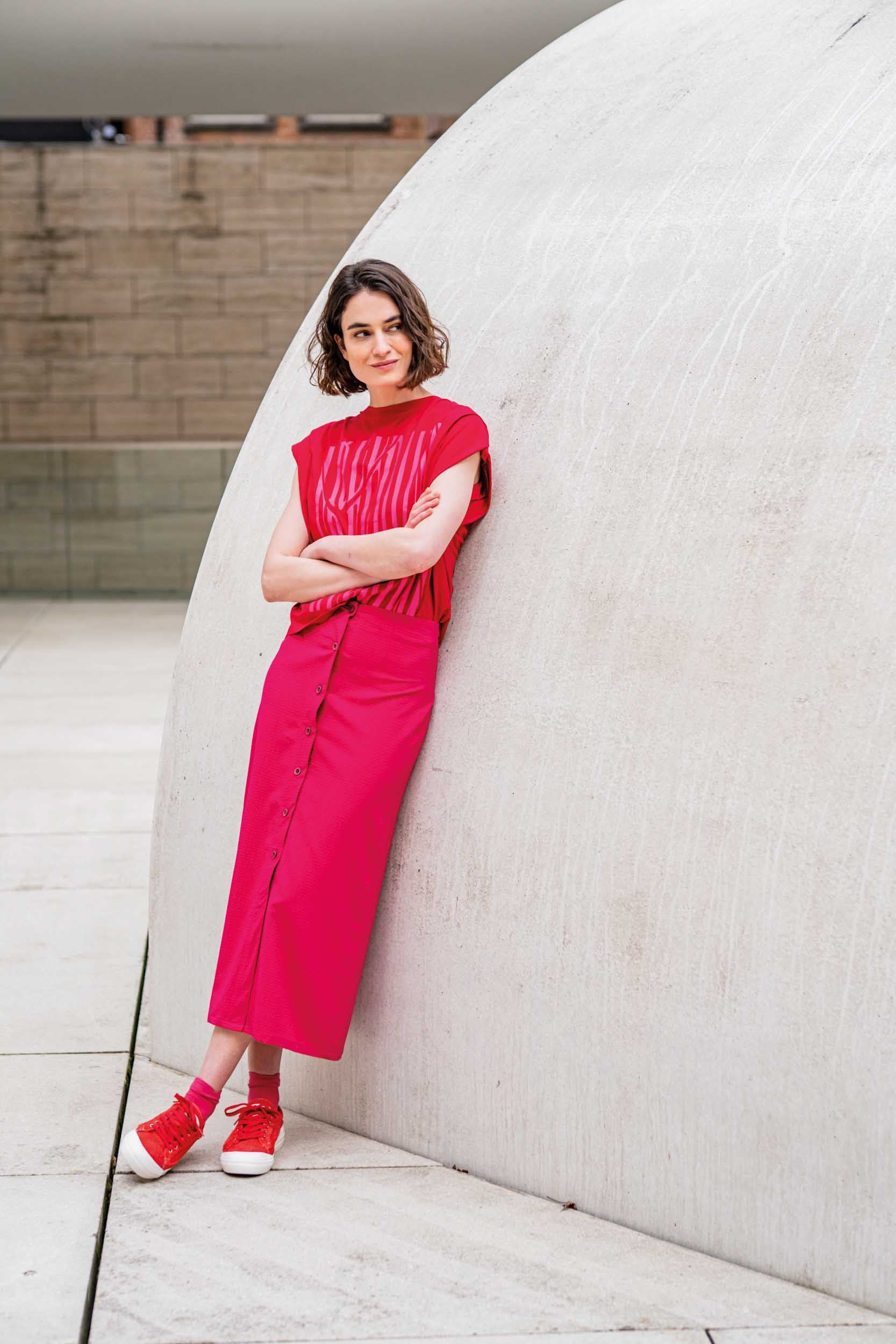 The button-down skirt is a delightful classic that is easy to style. The model is closely fitted at the hips and drops in a light A-line towards the hem.
