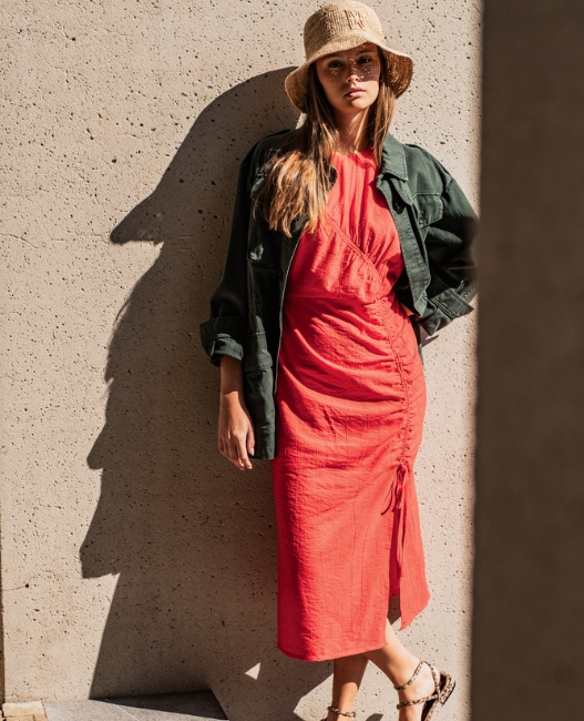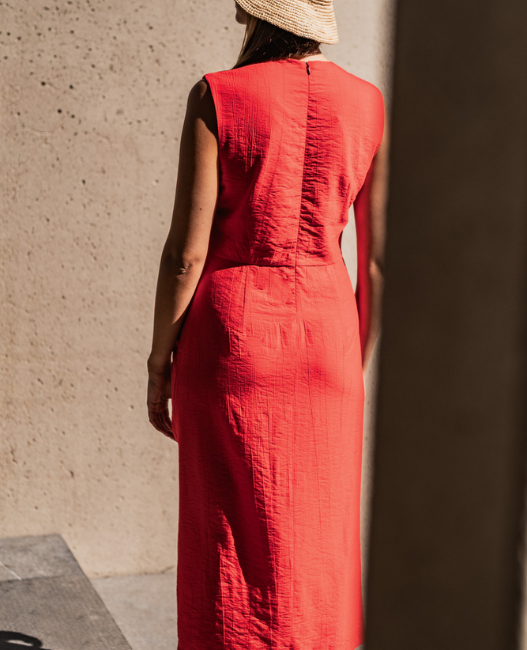 Let's talk Muriel. This fitted, sleeveless midi dress is a real showstopper.